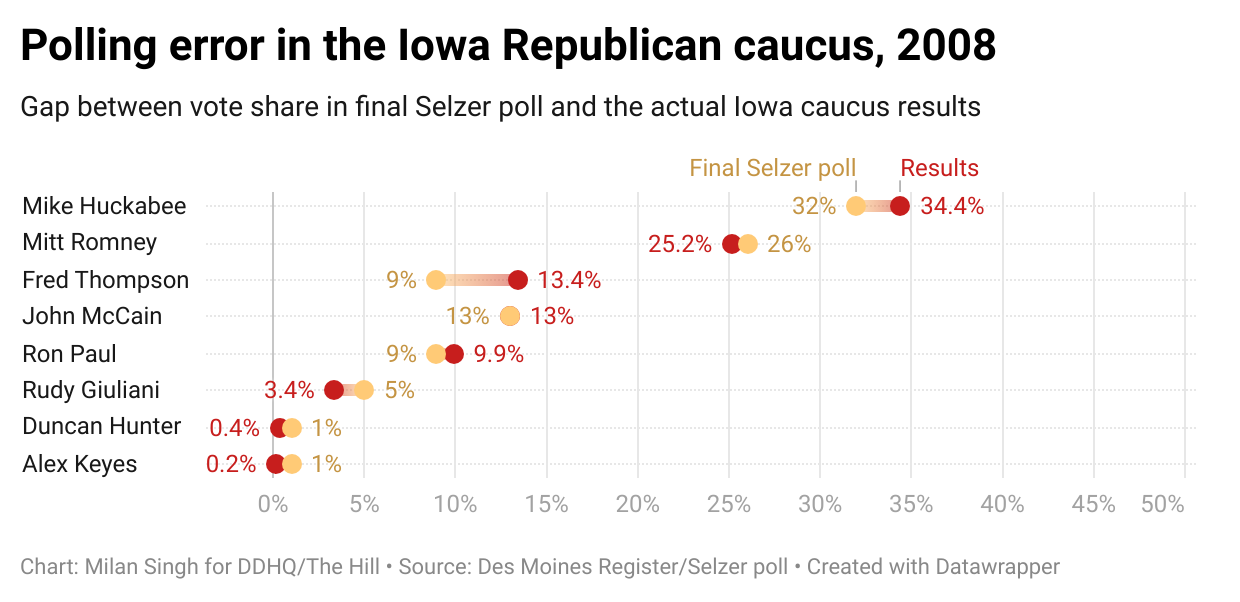 In 2000, Selzer’s final poll nailed George W. Bush’s final vote share in Iowa but significantly underestimated Steve Forbes. Bush, the frontrunner, went on to easily win the Republican nomination; John McCain came in second nationally.